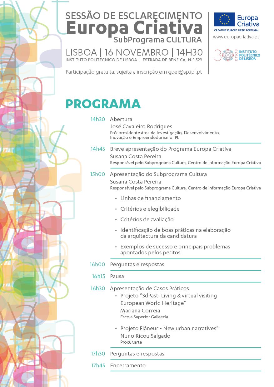 No próximo dia 16 de Novembro realizar-se-á em Lisboa uma sessão de esclarecimento dedicada ao Subprograma Cultura do Programa Europa Criativa . A sessão terá lugar no IPL - Instituto Politécnico de Lisboa, Estrada de Benfica 529, entre as 14h30 e as 17h45.